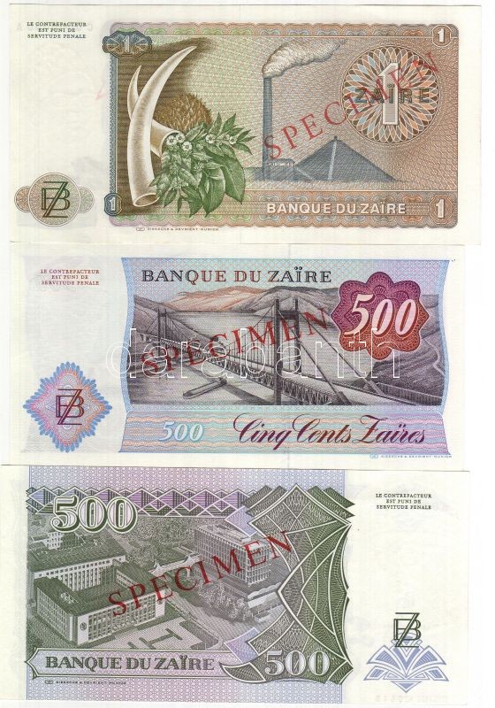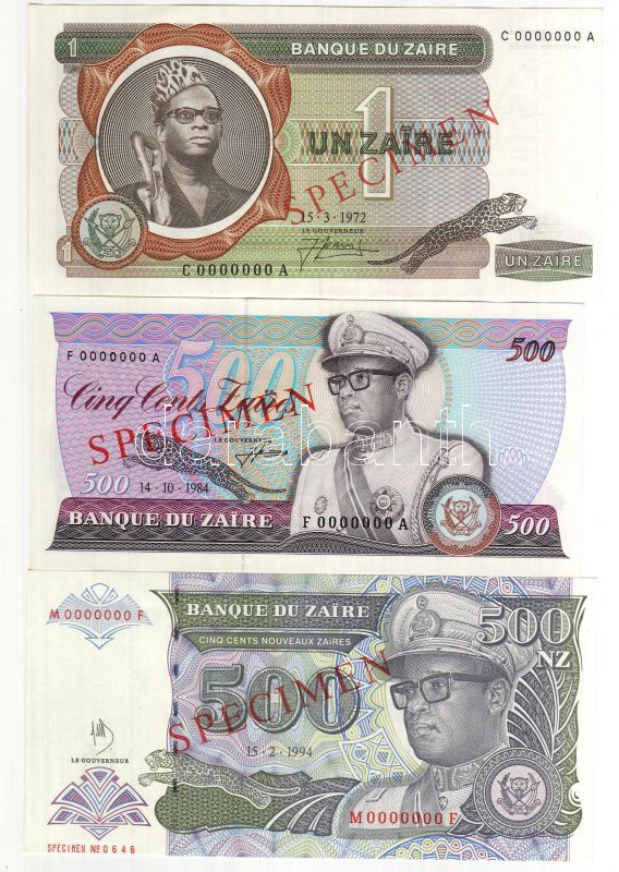 Zaire 1972. 1Z, 1984. 500Z, 1994. 500Z 3 klf db "Specimen" fny-sal T:I https://www.darabanth.com/de/34-Fernauktion/34.0/Numismatik/~126/Zaire-1972-1Z-1984-500Z-1994-500Z-3-klf-db-Specimen-fny-sal-TI~II68393