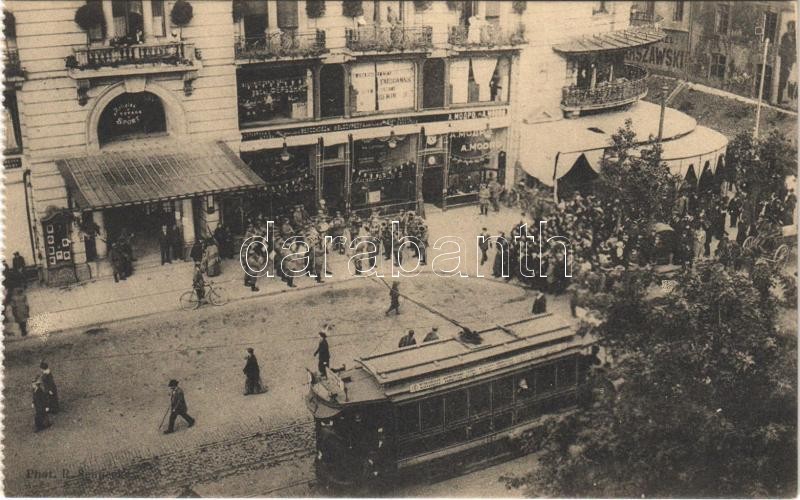 Warszawa, Warschau, Warsaw; Promenadenkonzert vor dem Hotel Bristol, einem der Verkehrsmittelpunkte Warschaus / promenade concert in front of the hotel, tram, public transport point, shop of A. Modro