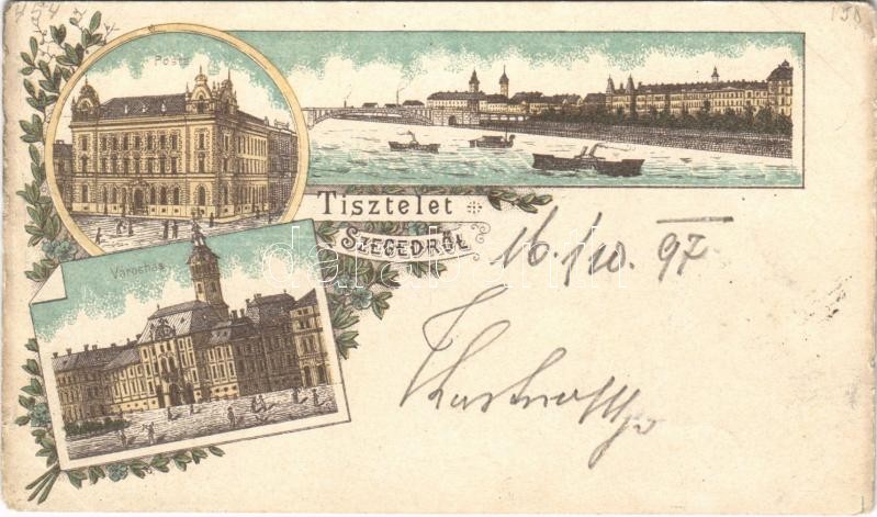 Beschreibung: 1897 (Vorläufer) Szeged, Posta, Városház, Tisza. Art Nouveau, floral, litho (EK)
