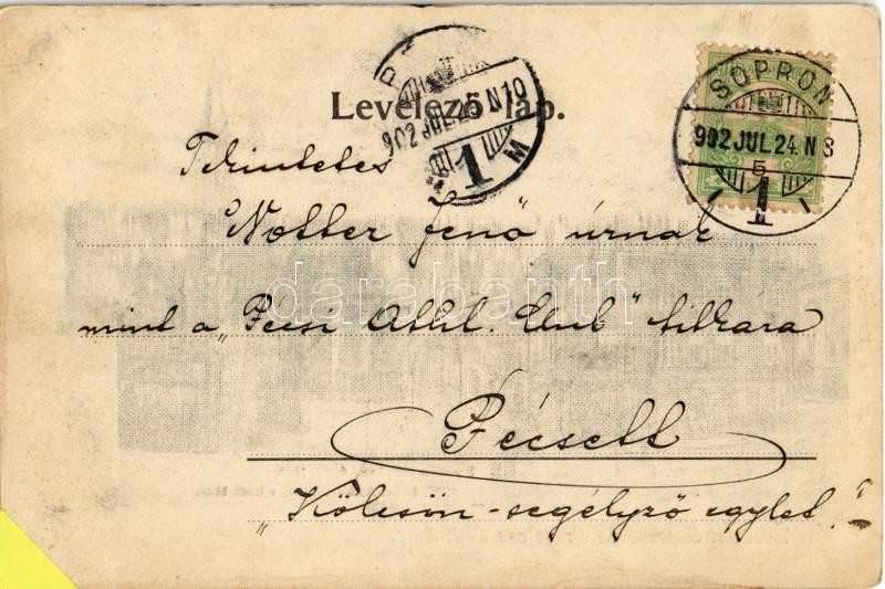 Beschreibung: 1902 Sopron, Oedenburg; Bencés templom (épült 1526), Szentháromság szobor, gyógyszertár (r)