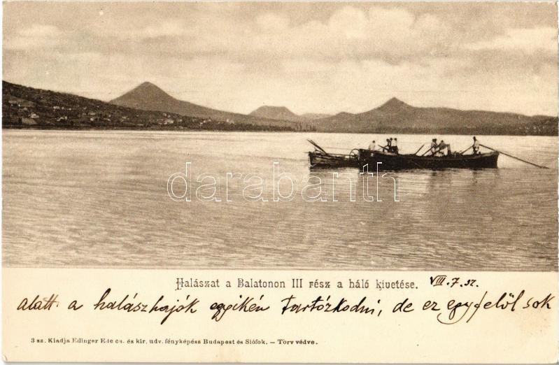 Balaton, halászat III. rész, a háló kivetése. Kiadja Eilinger Ede fény... https://www.darabanth.com/de/34-Gross-Auktion/34.1/Ansichtskarten/Ungarn~14307/Balaton-halaszat-III-resz-a-halo-kivetese-Kiadja-Eilinger-Ede-fenykepesz-3-sz~II1971222
