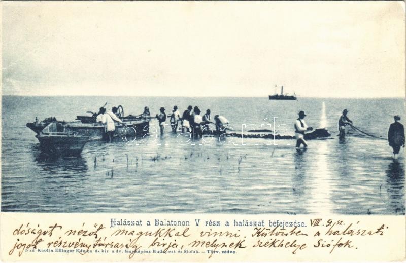 Beschreibung: Balatoni élet, Halászat a Balatonon V. A halászat befejezése, halászok hálóval, gőzhajó. Ellinger Ede kiadása
