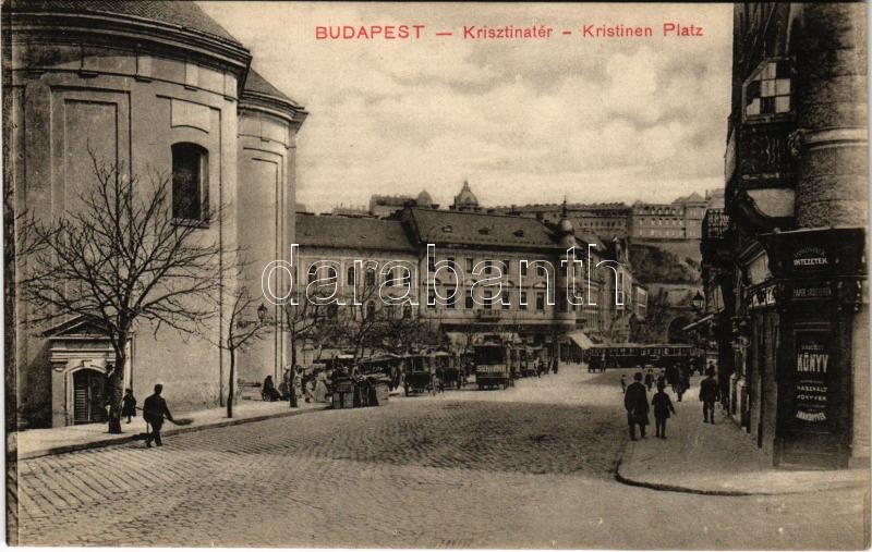 Budapest I. Krisztina tér, templom, piac, lovaskocsi Schicht reklámmal, villamos, Tankönyvek Intézetek, papír írószer és könyves üzlet, háttérben a vár