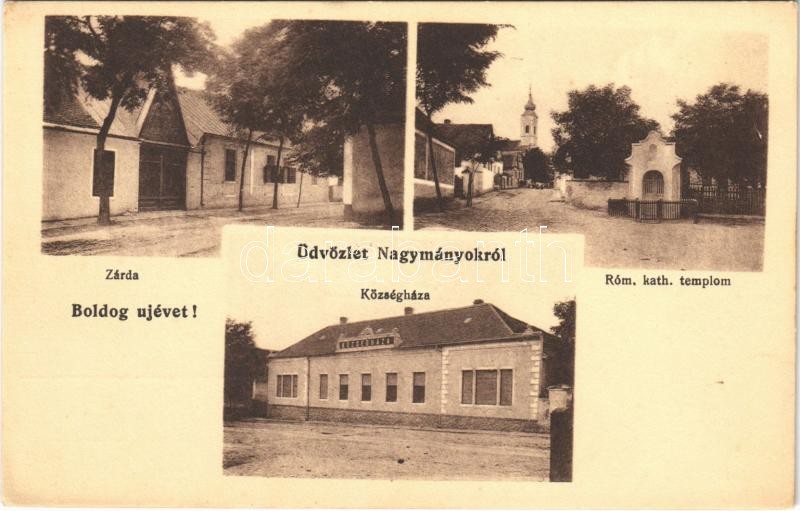 Nagymányok, zárda, római katolikus templom, községháza. Boldog újévet! https://www.darabanth.com/de/34-Gross-Auktion/34.1/Ansichtskarten/Ungarn~14307/Nagymanyok-zarda-romai-katolikus-templom-kozseghaza-Boldog-ujevet~II2246152