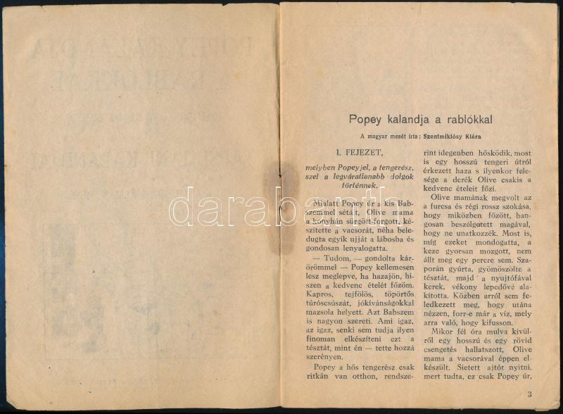Szentmiklósy Klára-Nógrádi Czira Kálmán: Popey kalandja a rablókkal.Szentmiklósy Klára meséje és Tapsi Jani kalandjai. Nógrád Czira Kálmán meséje. Bp.,[1942], Scala, (Szeged Városi Nyomda Rt.), 30 p. Kiadói papírkötésben, foltos, a lap alján kis hiányokkal.