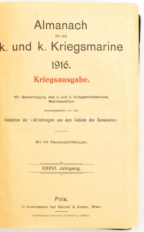 Almanach für die k. und k. Kriegsmarine 1916. Kriegsausgabe. XXXVI. Jahrgang. Mit Genehmigung des k. und k. Kriegsministeriums, Marinesektion herausgegeben von der Redaktion der ,,Mitteilungen aus dem Gebiete des Seewesens". Mit 141 Panzerschiffskizzen. Pola [Pula], 1916. Gerold & Komp, Wien. VIII + 746 + [10] p. A lapszámozáson belül 141 páncélozott hadihajó vázlatrajzával. Kiadói, dombornyomásos egészvászon kötésben./