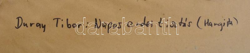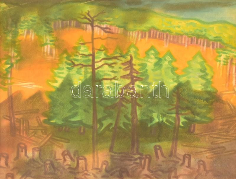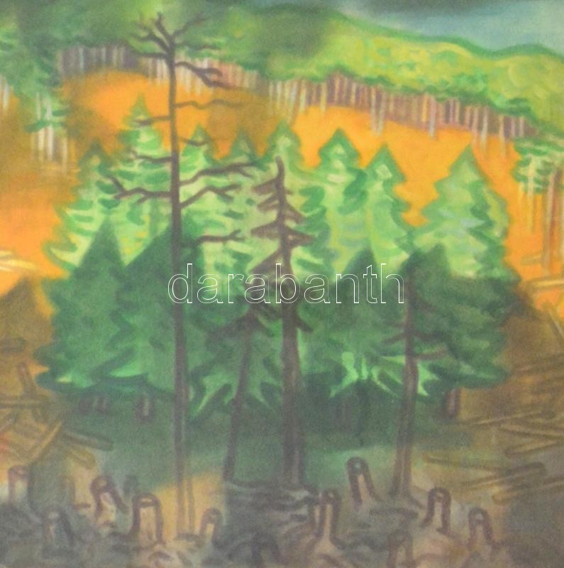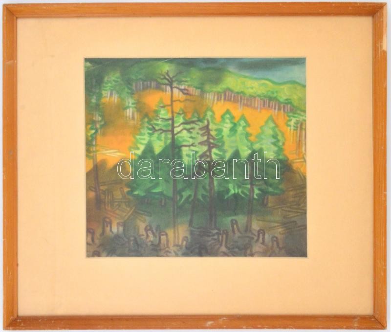 Duray Tibor (1912-1988): Napos Erdei tisztás (Hargita). Akvarell, pasztell, papír. Jelzett, hátoldalán feliratozott. Üvegezett, kissé sérült keretben. A művész erdélyi, székelyföldi helyszíneket ábrázoló alkotásai ritkán szerepelnek árverésen. 32x36 cm / Tibor Duray (1912-1988): Sunny clearing (Harghita). Watercolour, pastel on paper. Signed, with description on the back. Framed with glass. Duray's transylvanian-romanian landscapes are seldom for sale at auction.