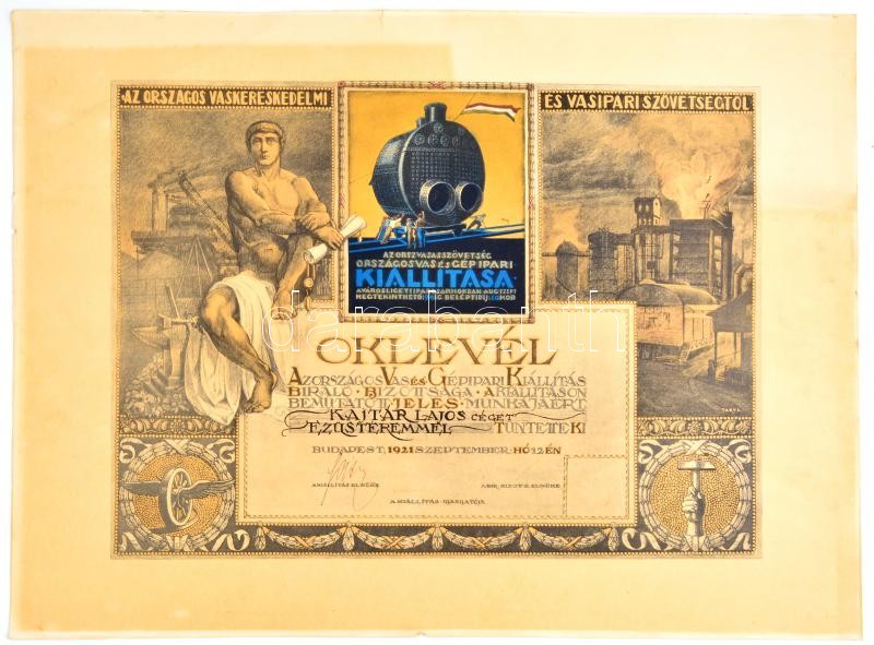 1921 Tary Lajos (1884-1972): Országos Vas és Gépipari Kiállítás díszes ezüst érmes oklevele, a bizottság elnökének aláírásával, kiállítás rendezője: Országos Vasas Szövetség, jelzett, színes litografált oklevél, szakadt, az egyik sarkán gyűrődésnyommal, 49x66 cm