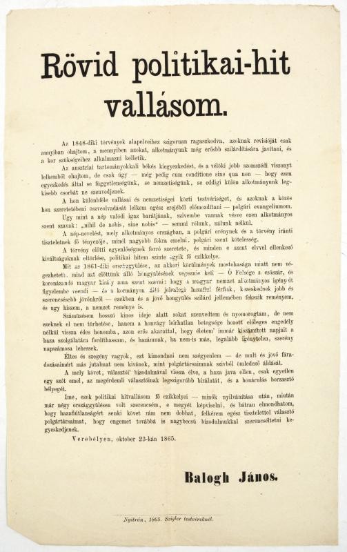 1865 Balogh János (1796-1872): Rövid politikai-hitvallásom. "Az 1848-diki törvények alapelveihez szigoruan ragaszkodva, azoknak a revisióját csak annyiban ohajtom, amennyiben azokat, alkotmányunk még erősbb szilárdítására javítani, és a kor szükségeihez alkalmazni kelletik. Az ausztriai tartományokkali békés kiegyezkedést, és a vélöki jobb szomszédi viszonyt lelkemből ohajtom, de csak úgy - még pedig cum conditione sine qua non - hogy ezen egyezkedés által se függetlenségünk, se nemzetiségünk, se eddigi külön alkotmányunk legkisebb csorbát ne szenvedjenek..." Verebély/Vráble, október 23-kán 1865. Nyitra, 1865., Szigler testvérek-ny., 1 sztl. lev. Balogh János (1796-1872): politikus, országgyűlési képviselő, kormánybiztos, honvédtiszt. A reformellenzék egyik képviselője és vezére volt Bars vármegye országgyűlési követeként, részt vett az 1848-49-es forradalomban és szabadságharcban. Honvédtisztként az alezredesi rangig vitte. Később a szabadságharc bukása után Bem Józseffel Törökországba ment. Távollétében halálra ítélték, és csak hosszú emigráció után térethetett haza.