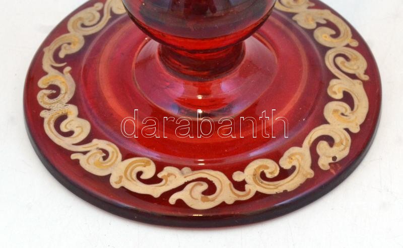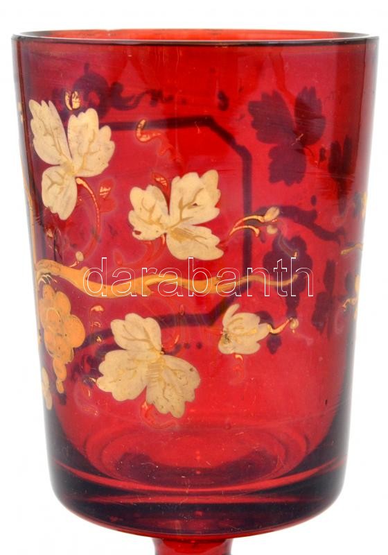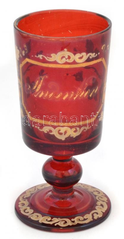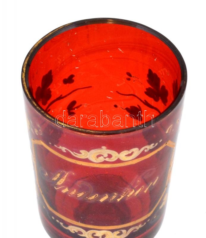 XIX. sz. vége: Rubinvörös üveg emlékpohár, kopott "Andenken" felirattal. Fújt, kézzel festett, hibátlan, kis kopásokkal 16 cm / Handpainted antique glass. 16 cm