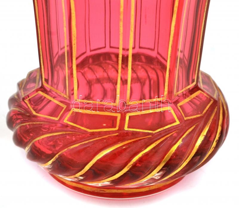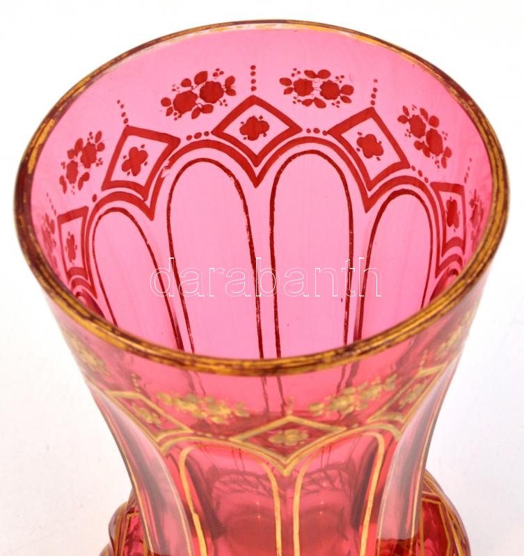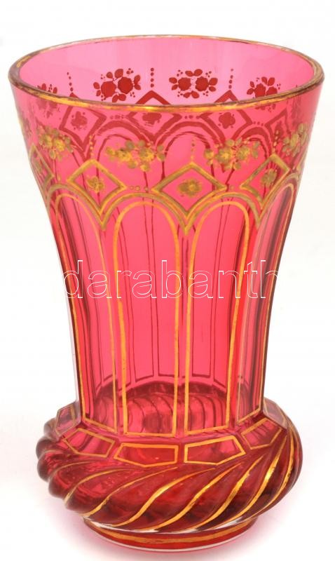 XIX. sz. vége: Rubinvörös üveg pohár. Formába fújt, kézzel festett, hi... https://www.darabanth.com/de/34-Gross-Auktion/34.1/Kunst-Dokumente-andere-Sammelgebiete/Glassgegenstande~14257/XIX-sz-vege-Rubinvoros-uveg-pohar-Formaba-fujt-kezzel-festett-hibatlan-kis-kopasokk~II2163159