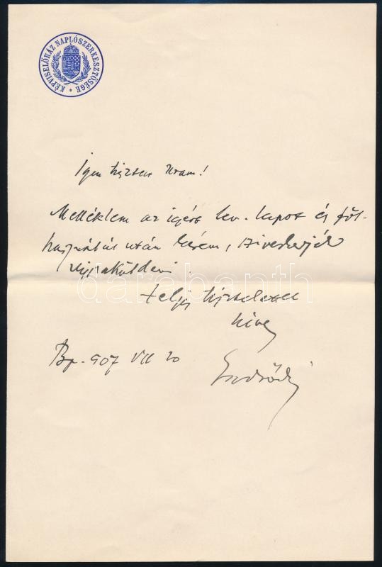 1907 Endrődi Sándor (1850-1920) költő, író, az MTA akadémikus autográf levele Petőfi témában. A levélben, melyet Gerő Ödönnek, a Petőfi albumot megjelentető Pesti Hírlap szerkesztőjének küldött, arra kéri, hogy a megküldött, (Petőfi házat ábrázoló) levelezőlapot küldje vissza.