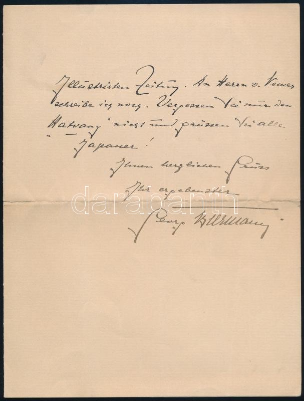 1911 Georg Biermann (1880-1949) német művészettörténész, lap- és könyvkiadó autográf levele Gerő Ödön műkritikusnak fejléces papíron, amelyben említést tesz arről, hogy Nemes (feltehetően Nemes Marcell műgyűjtő) és Szinyei (Merse Pál) megjelenési lehetőséget kapnak a Lipcsében megjelenő Illustrierte Zeitungban, Nemesnek külön is írni fog és említést tesz Hatvanyról is (Hatvany Lajos vagy Ferenc). Levelét "Grüssen Sie alle Japaner!" üdvözlettel zárja, azaz a Japán Kávéház asztaltársaságának küldi üdvözlő sorait. Biermann többek közt a Cicerone és a Monatshefte für Kunstwissenschaft kultúrális-művészeti lapokat adta ki. 1911-ben jelent meg a Klinkhardt&Biermann kiadónál Lázár Béla Szinyei Merse Páról írt könyve német nyelven./ Autograph letter of Gerorg BIermann, Leipzig, German art historian and editor of the magazines Cicerone and Monatshefte für Kunstwissenschaft to Edmund Gerö, Hungarian journalist, critic.
