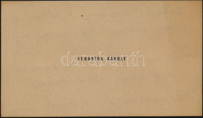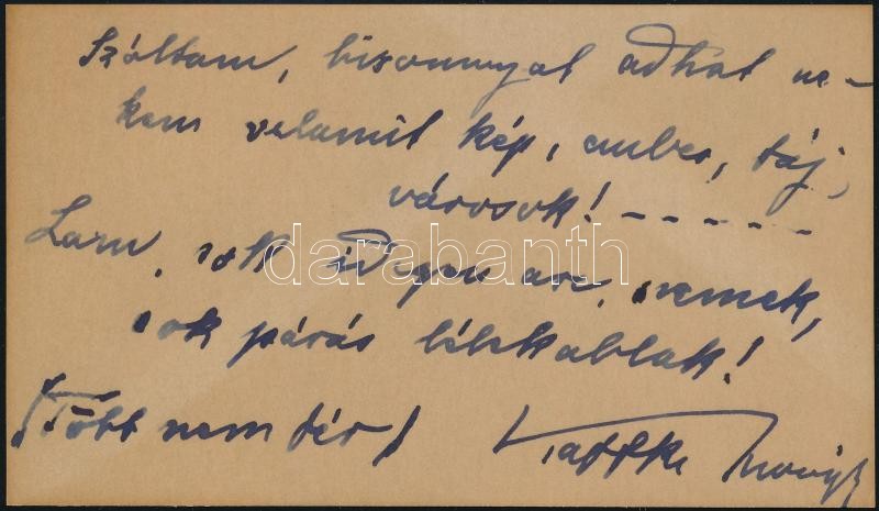 Kaffka Margit (1880-1918) író, költő autográf lírai sorai Kernstok Károly festőművész névjegykártyáján. "Szóltam, bizonnyal adhat nekem valamit kép, ember, táj, városok! .... Lam sok idegen arc, szemek, sok párás lélekablak! (Több nem fér) Kaffka Margit". Proveniencia: Gerő Ödön művészeti szakíró, újságíró lánya, Gerő Zsófia (1895-1966) hagyatékából.