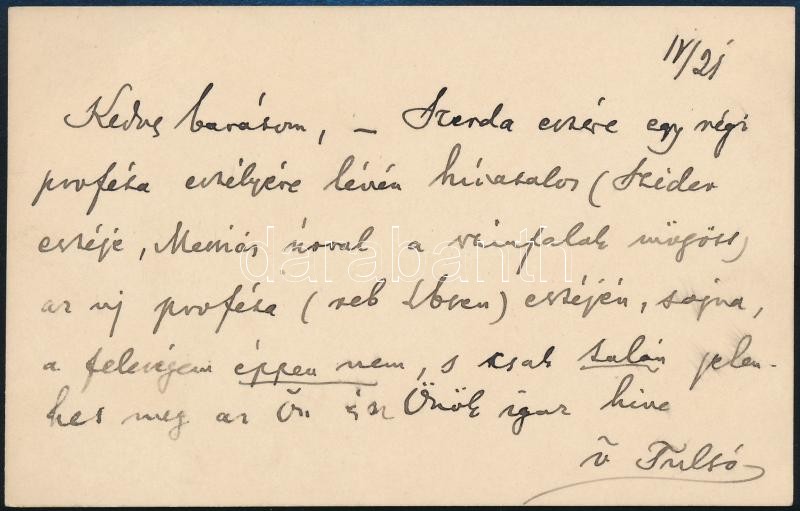cca 1910 Ágai Adolf ( Rosenzweig Adolf 1836-1916) autográf sorai névjegykártyáján Gerő Ödön (1863-1939) a Pesti Hírlap szerkesztőjének, melyben jelzi, hogy "szerda estére egy régi próféta estéjére lévén hivatalos (Széder estéje, Messiás úrral a színfalak mögött) az új próféta reb Ibsen estéjén" felesége nem tud részt venni + egy boríték