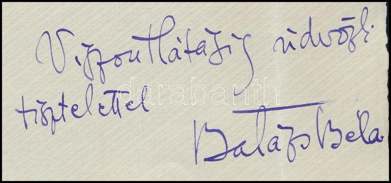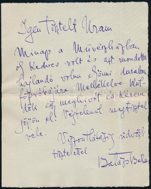 cca 1910 Balázs Béla (1884- 1949) költő, író, filmesztéta, filmrendező, filmfőiskolai tanár autográf levele Gerő Ödön (1863-1939) újságíró, műkritikusnak, melyben meghívja előadása főpróbájára és hivatkozik egy a Művészházban való találozásra.