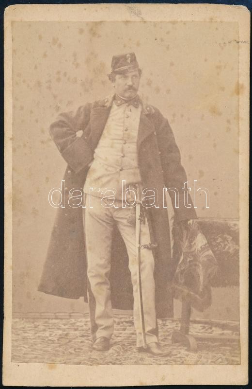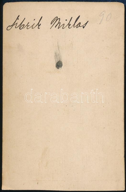 cca 1865 szarvaskendi Sibrik Miklós (1835-1866) a 27. Cs. és Kir. 27. Vadászzászlóalj hadnagya, (később 1866-ban, a königgrätzi csatában elhunyt), keményhátú fotója, a hátoldalon feliratozva, a felületén folttal, 10x6 cm.