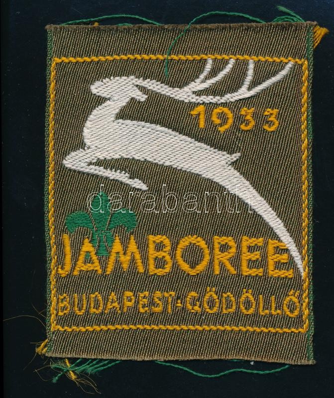 1933 "Jamboree Budapest-Gödöllő" feliratú díszes vászon felvarró, fehér csodaszarvassal, zöld liliommal, 7×5,5 cm / 1933 Richly ornated scout hemstitching with "Jamboree Budapest - Gödöllő" inscription on it, with white Wonderdeer and green fleur-de-lys, 7×5,5 cm