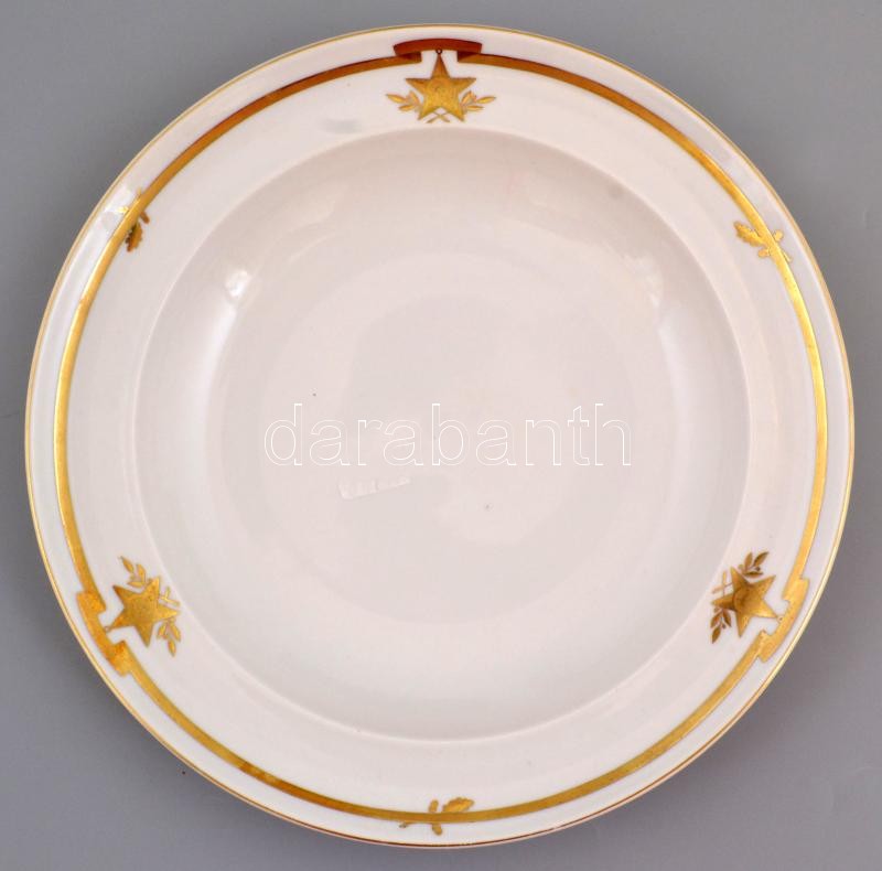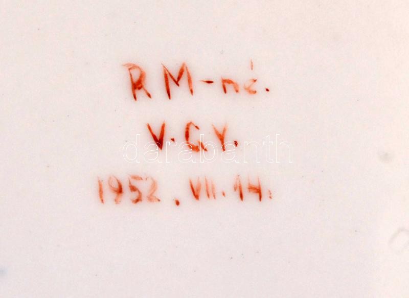 1952 Herendi porcelán mély tányér Rákosi címerrel. Feltehetően gyártás előtti egyedi mintadarab a festő nevével: R.M.-né V. Gy. 1952.. Kézzel festett. Benyomott jelzéssel, kopással d:25,5 cm