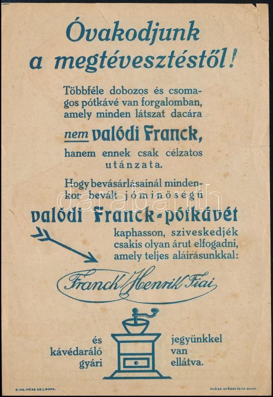 Beschreibung: "Kérjen Franck-ot a kávédaráló védjeggyel", Franck Henrik és Fiai reklámnyomtatvány, Bp., Klösz-ny., szakadt, 20x14 cm