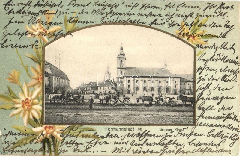 Nagyszeben, Hermannstadt, Sibiu; Grosser Ring / utcakép, lovaskocsik, templom. Kiadja Carl F. Jickeli, szecessziós virágos litho keret / street view, horse-drawn carriages, church. Art Nouveau, floral, litho frame (EK)
