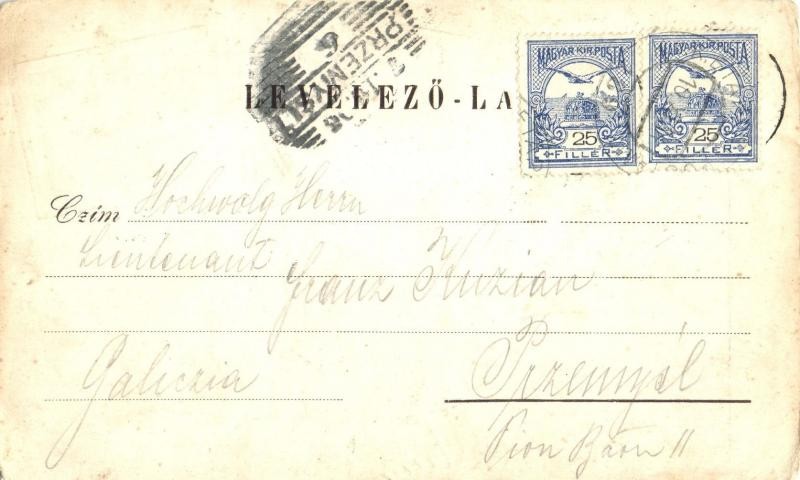1900 Nagymagyar, Velky Mager, Zlaté Klasy; Római katolikus templom, Erzsébet tér, Városháza, Fő tér, Gyógyszertár, Gróf Pálffy kastély (Kismagyar) / Catholic church, square, town hall, main square, pharmacy, castle in Maly Mager. Art Nouveau, floral (kopott sarkak / worn corners)