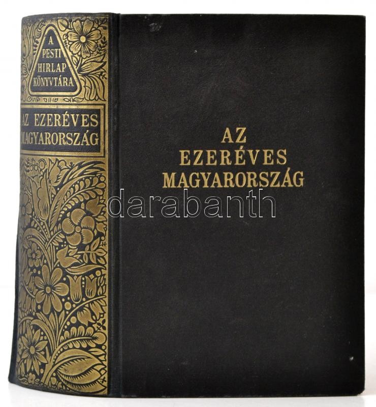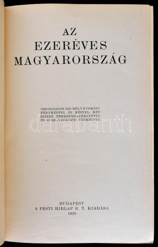 A Pesti Hírlap Könyvtára: Az ezeréves Magyarország. 1200 oldalon 1031 mélynyomású fényképpel és képpel, két színes térképmelléklettel és 82 szövegközti térképpel. Bp., 1939, A Pesti Hírlap Rt.,(Légrády-ny.), 1200 p. Első kiadás. Kiadói aranyozott egészvászon kötés, kissé kopott borítóval és gerinccel, kissé sérült kötéssel.