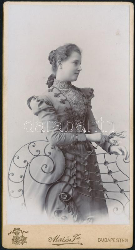Beschreibung: cca 1898 Fiatal lány műtermi portréja, hátoldalon ajándékozási sorokkal, keményhátú fotó Mai és Társa műterméből, 15×8 cm