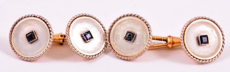 Beschreibung: Női mandzsetta gomb párban 14 K arany és gyöngyház, féldrágakővel Br: 10,3 g / Gold and nacre womens sleeve buttons.