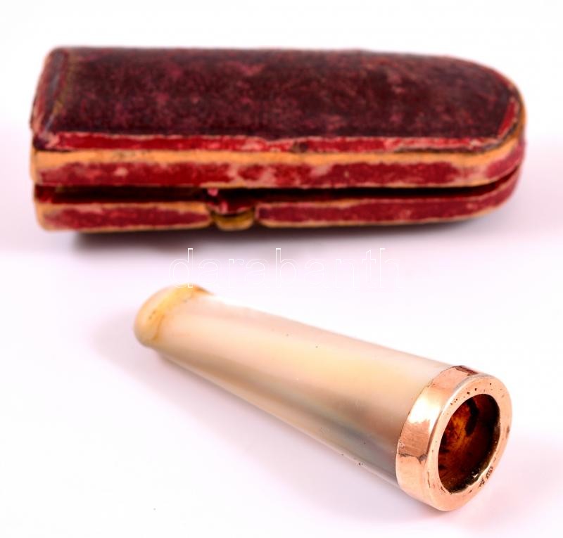 Beschreibung: Gyöngyház szipka, aranyozott ezüst(Ag) véggel, jelzett, tokban, h: 5 cm
