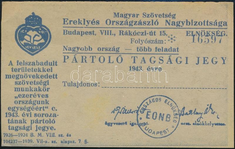 1943 Magyar Szövetség Ereklyés Országzászló Nagybizottsága pártoló tag... https://www.darabanth.com/de/340-Fernauktion/340.0/Kunst-Dokumente-andere-Sammelgebiete/Dokument~500017/1943-Magyar-Szovetseg-Ereklyes-Orszagzaszlo-Nagybizottsaga-partolo-tagsagi-jegy~II1913668