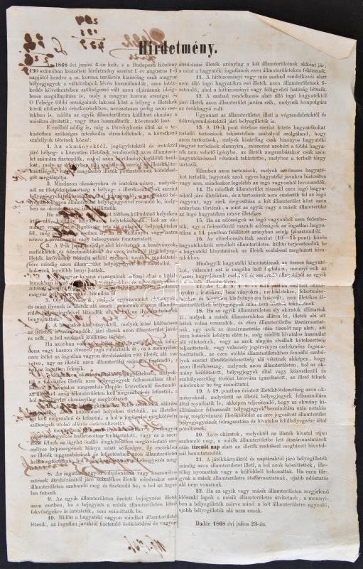 1868 Hirdetmény a Magyar Korona Országaiban használatos bélyegekről,. ... https://www.darabanth.com/de/340-Fernauktion/340.0/Kunst-Dokumente-andere-Sammelgebiete/Drucksachen~500029/1868-Hirdetmeny-a-Magyar-Korona-Orszagaiban-hasznalatos-belyegekrol-Atmeneti-rendelkezesek~II1912480