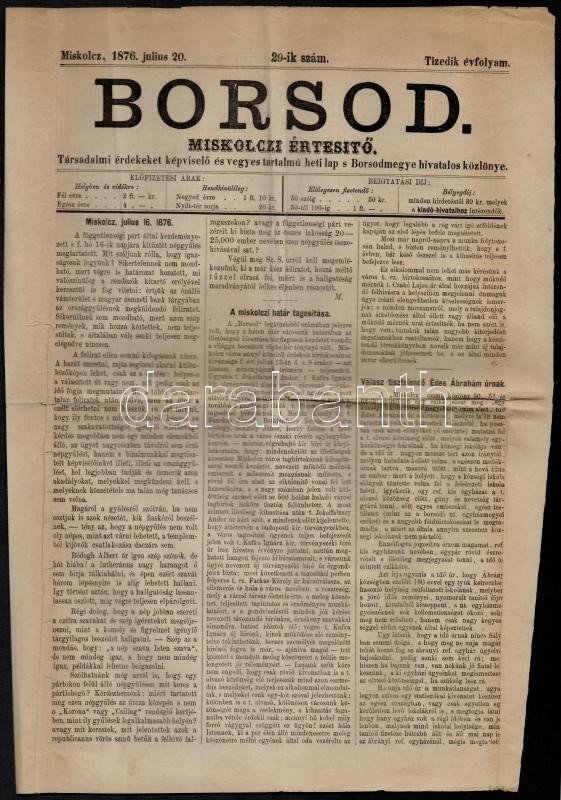 1876 Borsod. Miskolczi értesítő. X. évf. 29. sz. 1876. július. 20. Mis... https://www.darabanth.com/de/340-Fernauktion/340.0/Kunst-Dokumente-andere-Sammelgebiete/Drucksachen~500029/1876-Borsod-Miskolczi-ertesito-X-evf-29-sz-1876-julius-20-Miskolc-Racz-Adam-ny-2~II1909492