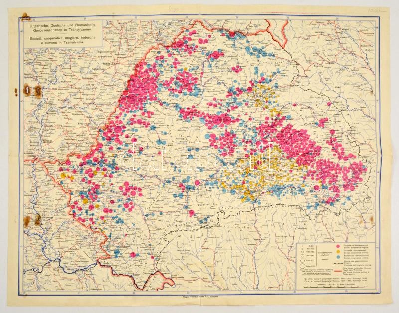 1935 Ungarische, Deutsche und Rumänische Genossenschaften in Transylvanien / Societa cooperative magiare, tedesche e rumene in Transilvania, Erdélyi szövetkezetek nemzetiségi megoszlása, 1:900000, Bp., Magyar Földrajzi Intézet, kicsit foltos, 50×62 cm