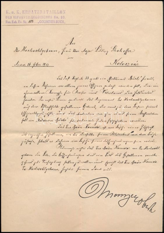1917 Arad, Cs. és Kir. 33. ("II. Lipót") gyalogezred helyettesítő zászlóaljának levele, Kolozsvárra, Strohoffer Lajos őrnagy részére, az "adakozók Aranykönyve" ügyében, német nyelven.