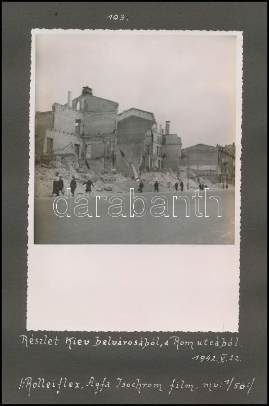 1942 Kijev belvárosa a német, magyar támadás után . 2 db jó minőségű fotó Ferdinkó Béla fotóstól feliratozva, a használt gép és film megjelölésével. Albumlapon. / 1942 Eastern front of WW II. Two photos of Kiew. Photo size: 13x18 cm