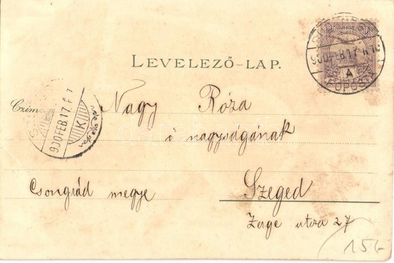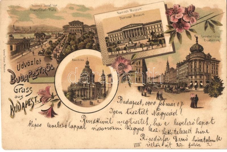 Beschreibung: 1900 Budapest, Ferenc József tér, Nemzeti Múzeum, Erzsébet körút, villamos, Bazilika. Ottmar Zieher Art Nouveau, floral, litho (szakadás / tear)