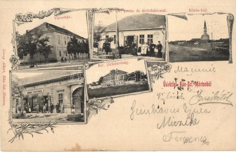 1901 Kunszentmárton, Városház, Kir. Járásbíróság, Körös híd, M. kir. posta és távírda hivatal, Némedy testvérek üzlete. Sáray Albert kiadása, floral, Art Nouveau