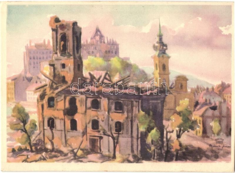 Budapest I. Budai Szerb ortodox templom 1945 tavaszán, romok; Második világháború. Kiadja Piatnik Nándor és Fiai / WWII destructions, ruins in Budapest s: Blaski János (EK)
