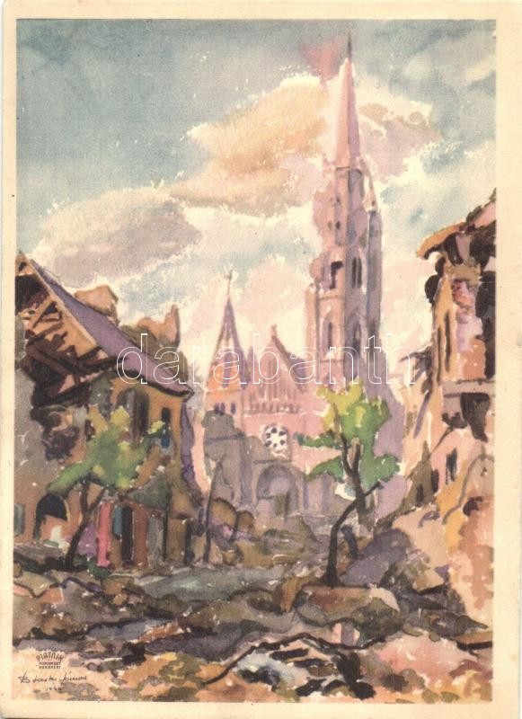 Budapest I. Budai vár, Koronázó templom 1945 tavaszán, romok; Második világháborús. Kiadja Piatnik Nándor és Fiai / WWII destructions, ruins in Budapest s: Blaski János (EK)