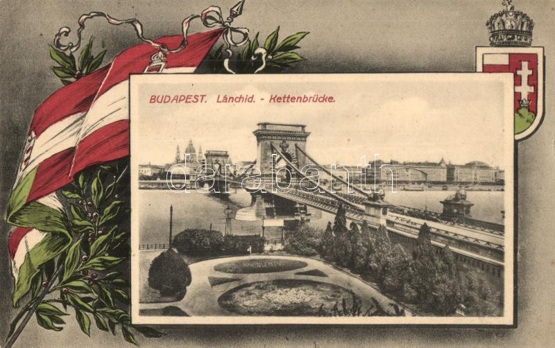 Budapest, Lánchíd. Magyar zászlós és címeres keret / Hungarian flag an... https://www.darabanth.com/de/341-Fernauktion/341.0/Ansichtskarten/Ungarn~1500005/Budapest-Lanchid-Magyar-zaszlos-es-cimeres-keret-Hungarian-flag-and-coat-of-arms-frame~II1921266