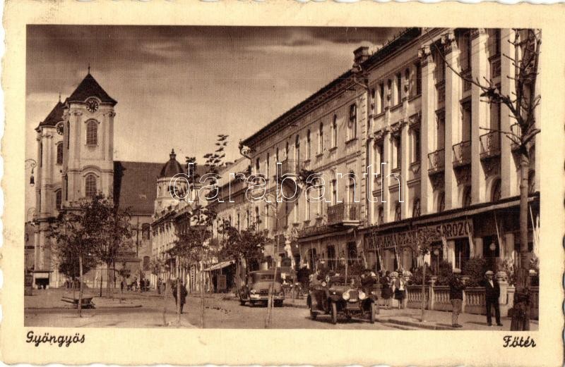 Gyöngyös, Fő tér, Hungaria étterem és söröző, automobilok, templom https://www.darabanth.com/de/341-Fernauktion/341.0/Ansichtskarten/Ungarn~1500005/Gyongyos-Fo-ter-Hungaria-etterem-es-sorozo-automobilok-templom~II1920034