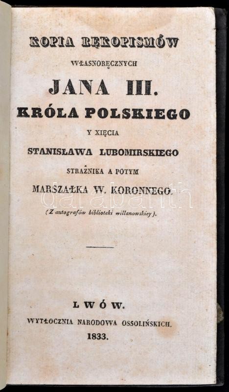 Marszałka W. Koronnego: Kopia rękopismów własnoręcznych Jana III. Króla Polskiego y Xięcia S. LubomirskiegoLwów 1833. 98p. Korabeli egészvászon kötésben / Full linen binding.