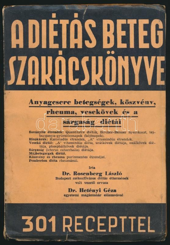 Dr. Rosenberg László: A diétás beteg szakácskönyve. Változatos étrendek. II. kötet: Anyagcsere betegségek, köszvény, rheuma, vesekövek, és sárgaság diétái. Dr. Hetényi Géza előszavával. Bp.,é.n., Novák Rudolf. Kiadói papírkötés, a borítón kis folttal, kis szakadással, pár oldalon ceruzás aláhúzással.