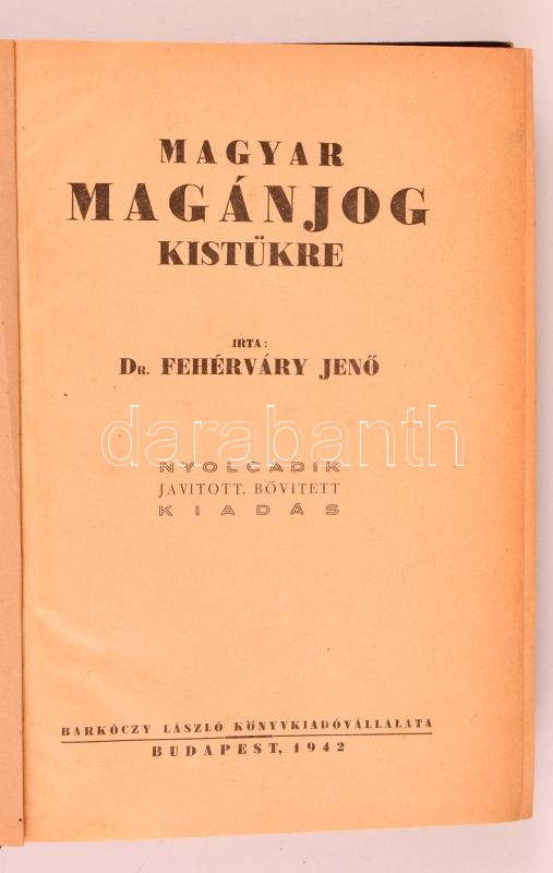Fehérváry Jenő: Magyar magánjog kistükre. Bp., 1942, Barkóczy László Könyvkiadóvállalata, (Nagyvárad,"Grafika"-ny.), XV+618 p. Átkötött félvászon-kötésben, jó állapotban.