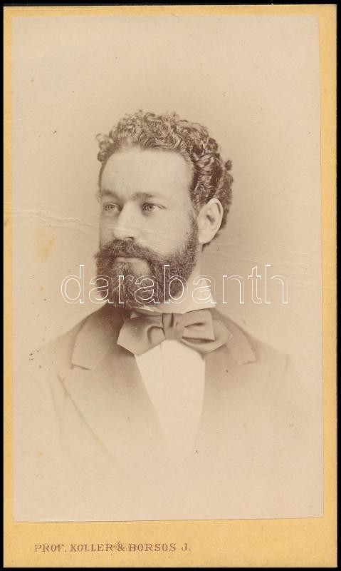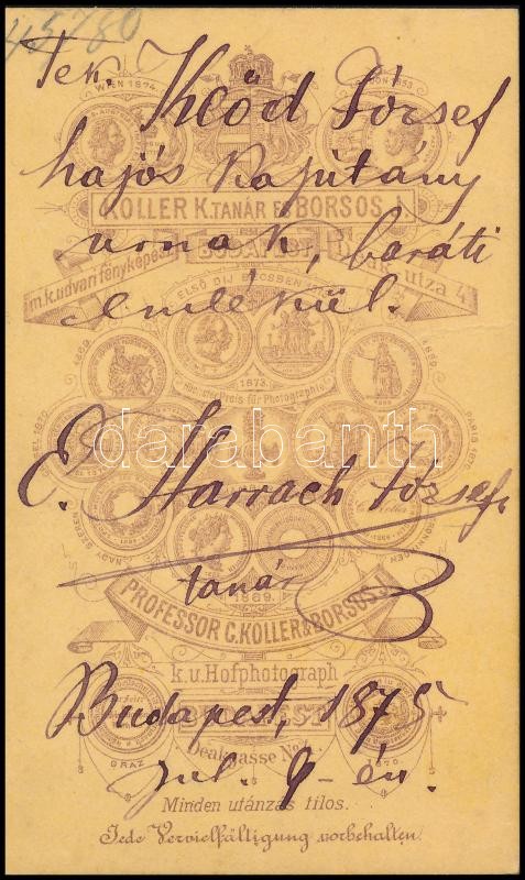 Harrach József (1848-1899.) zeneesztéta, zenetörténész, tanár fotója Füredi Keöd József (1839-1897) színész, balatoni és dunai hajóskapitánynak dedikálva 6,5x10,5 cm