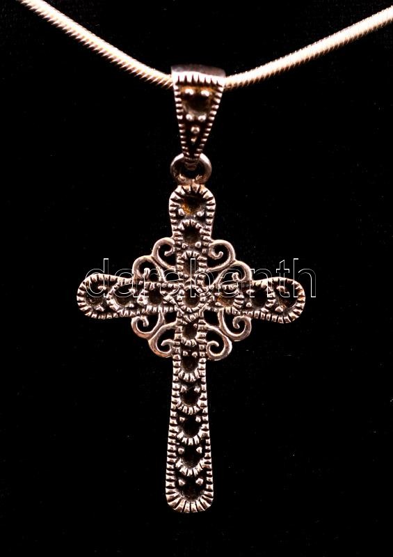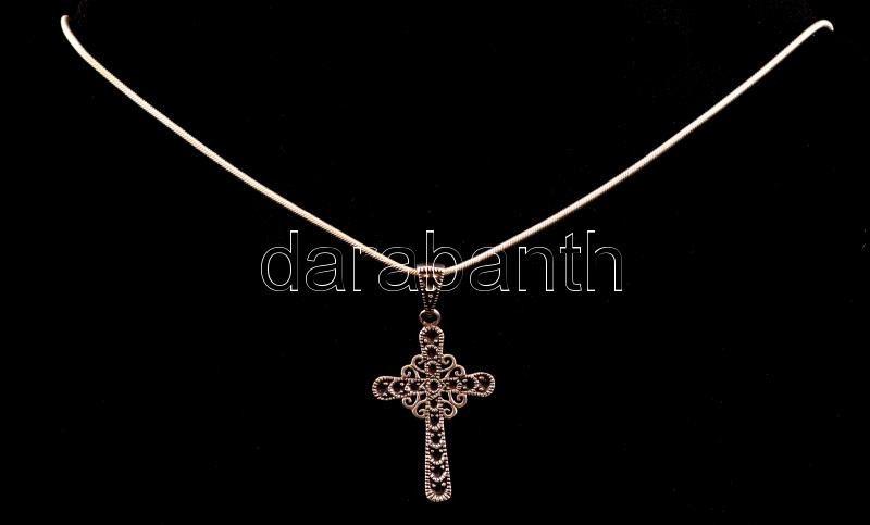 Beschreibung: Ezüst(Ag)kígyó nyaklánc, jelzett, h: 45-50 cm + filigrán kereszt függő, jelzett, 3,8×2 cm, nettó: 8,8 g