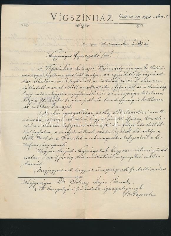 1900 Bp., A Vígszínház igazgatósága által polgári fiú reáliskola igazg... https://www.darabanth.com/de/341-Fernauktion/341.0/Kunst-Dokumente-andere-Sammelgebiete/Dokument~500017/1900-Bp-A-Vigszinhaz-igazgatosaga-altal-polgari-fiu-realiskola-igazgatojanak-kuldott-~II1921052
