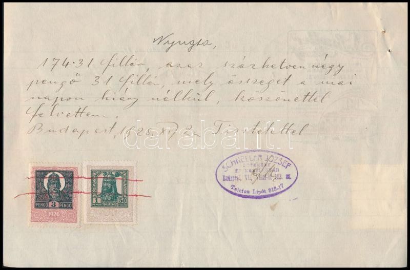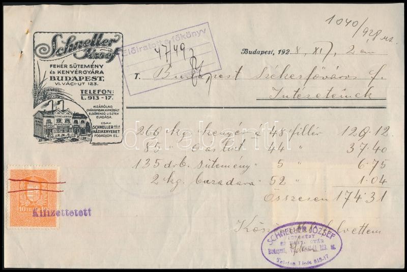 Beschreibung: 1928 Bp., Schneller József Fehér Sütemény és Kenyérgyára fejléces számlája okmánybélyeggel