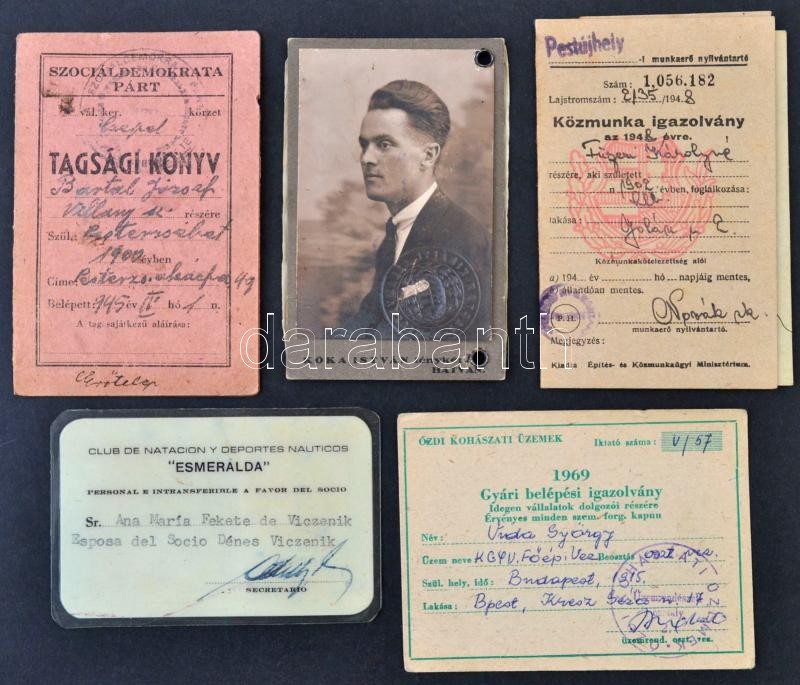 5 db különféle igazolvány: MÁV, szocdem tagsági, közmunka, stb. https://www.darabanth.com/de/341-Fernauktion/341.0/Kunst-Dokumente-andere-Sammelgebiete/Dokument~500017/5-db-kulonfele-igazolvany-MAV-szocdem-tagsagi-kozmunka-stb~II1916997